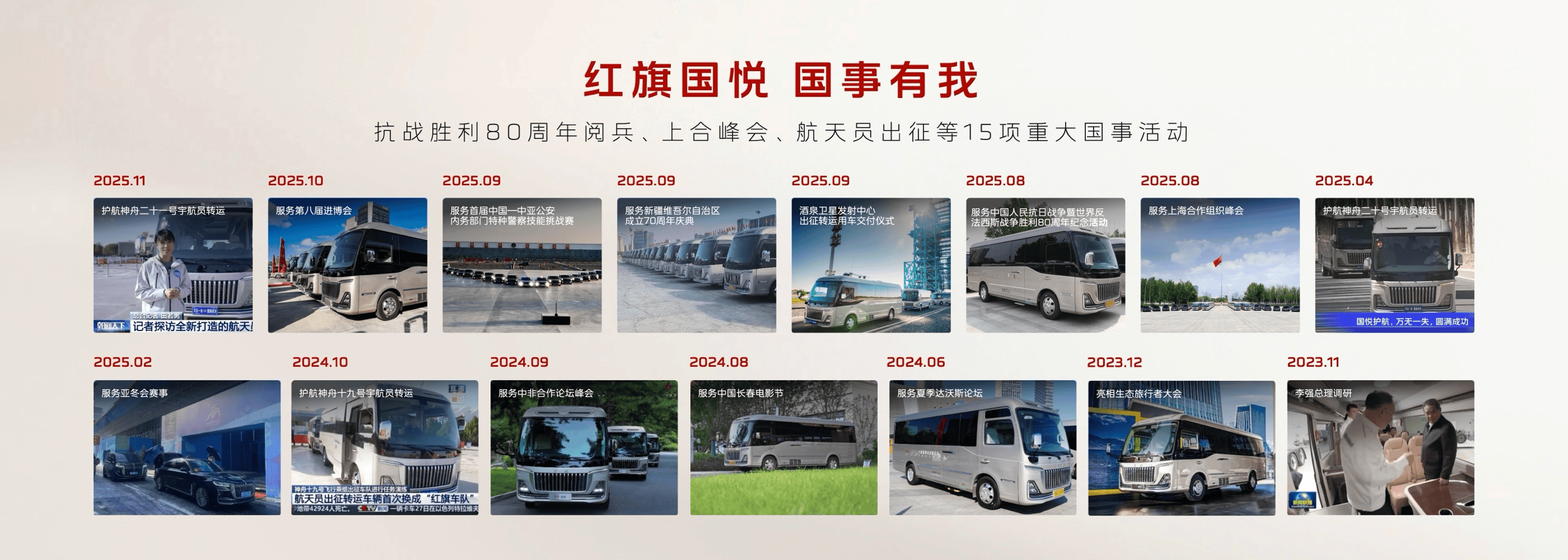 “国家大事有红旗”,红旗金葵花国悦始终践行“国事有我”的使命担当。早在2024年,红旗金葵花国悦便服务于酒泉卫星发射中心,承担神舟十九号载人飞行任务航天员转运保障任务。此后,红旗持续助力航天事业,以专业化、定制化改造,成为航天员专用转运车,为航天员出征提供陆地护航,更相继服务于中非合作论坛、上合峰会、纪念中国人民抗日战争暨世界反法西斯战争胜利80周年阅兵式等一系列高规格国事活动的交通服务保障任务。凭借可靠的性能与出色的表现,红旗金葵花国悦屡获各方的高度评价,尽显“国车”品质与风范。