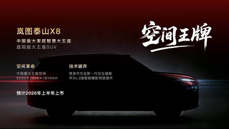 1月28日,岚图汽车重磅发布2026年产品计划,宣布将推出四款全新车型,包括中国首款量产L3级SUV岚图泰山Ultra、“庭院级大五座SUV”岚图泰山X8,代号为“FE”的全新FUV,以及代号为“珠峰”的“50万级行业最强”MPV。其中,岚图泰山X8将于2026年上半年上市。该车将搭载问界M9同款四激光雷达,首发华为全新一代交互座舱,同时还拥有独一无二的巨大空间,彰显了岚图汽车在智能化、高端化上的坚定决心。