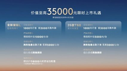 本次上市三款新车精准覆盖用户全场景创富需求,官方定价亲民实在。全新星际L售价10.88-15.98万元,26款星际EV售价24.98万元,26款T60售价7.98-10.18万元。即日起至2026年4月30日,下订用户更能享5重上市礼遇,综合权益至高3.5万元,全方位降低购车与用车成本。