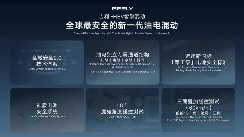 吉利汽车发布的 i-HEV智擎混动硬核实力也得到了七大权威认证加持,从吉尼斯最低油耗、全球最高热效率,到 HEV 车型 1 级能效、极限碰撞与耐久认证,每一项都印证了技术实力。